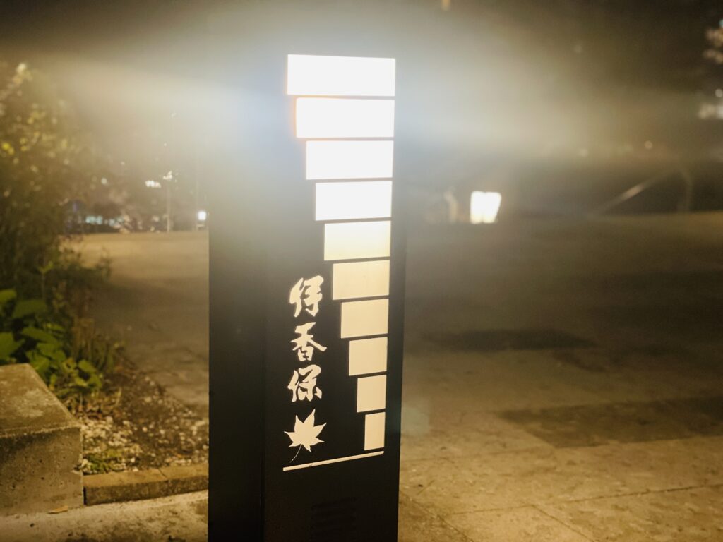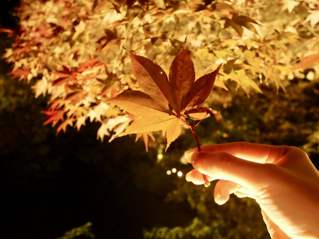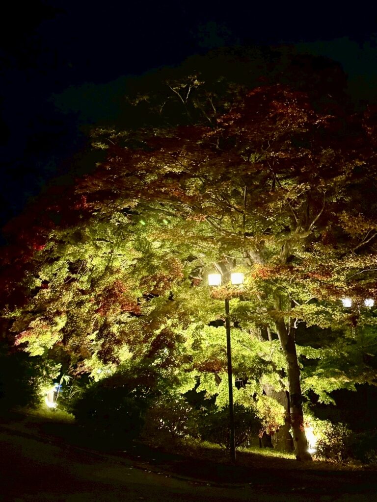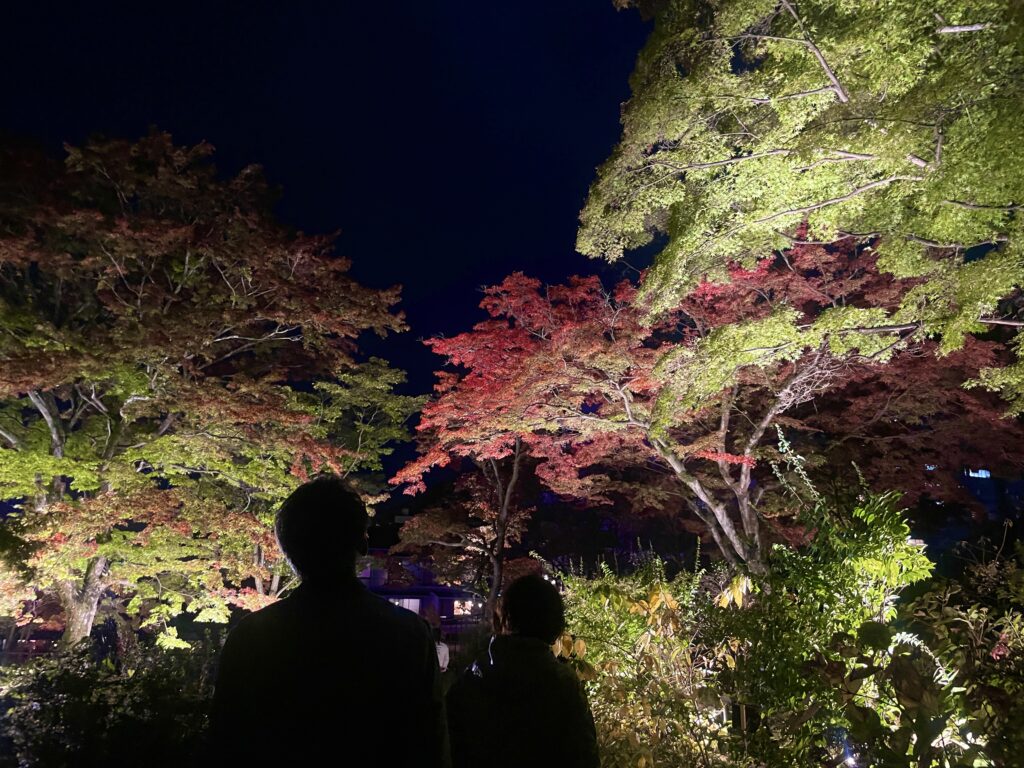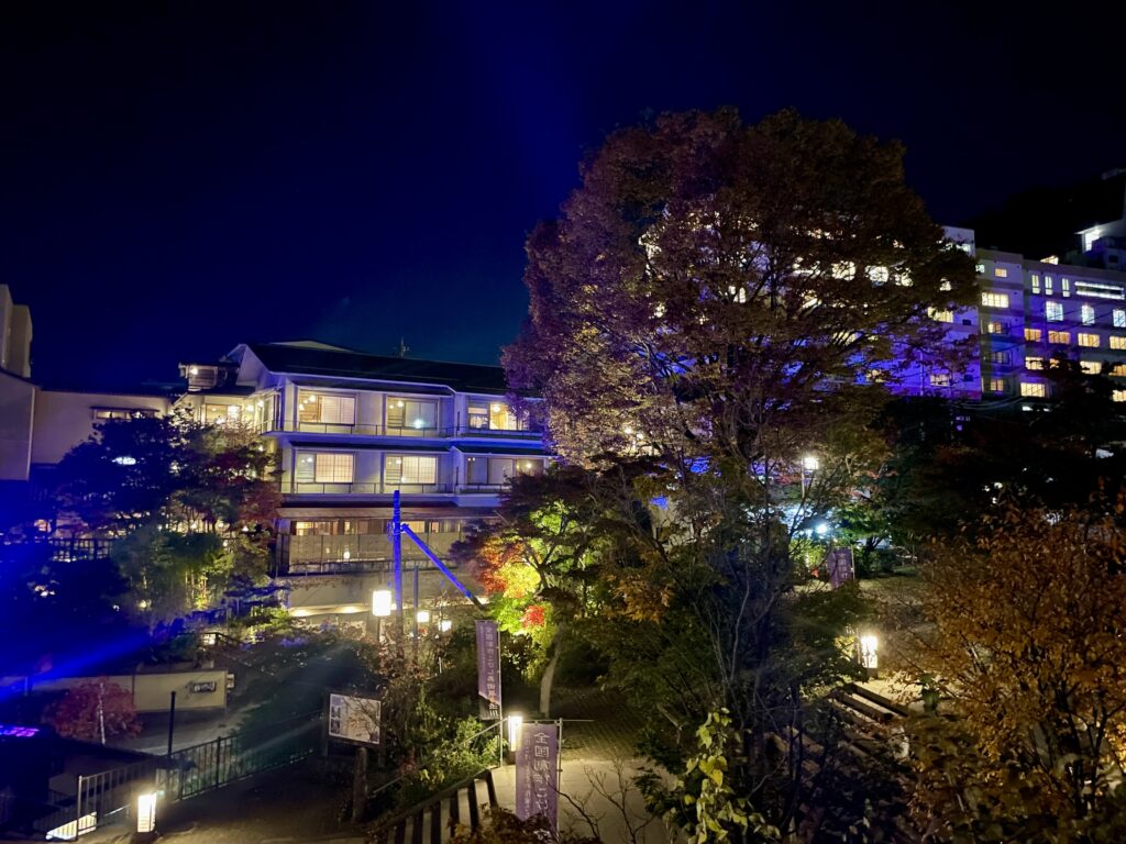 赤や黄色に色づいた木々が夜の温泉街を幻想的に照らし出し、