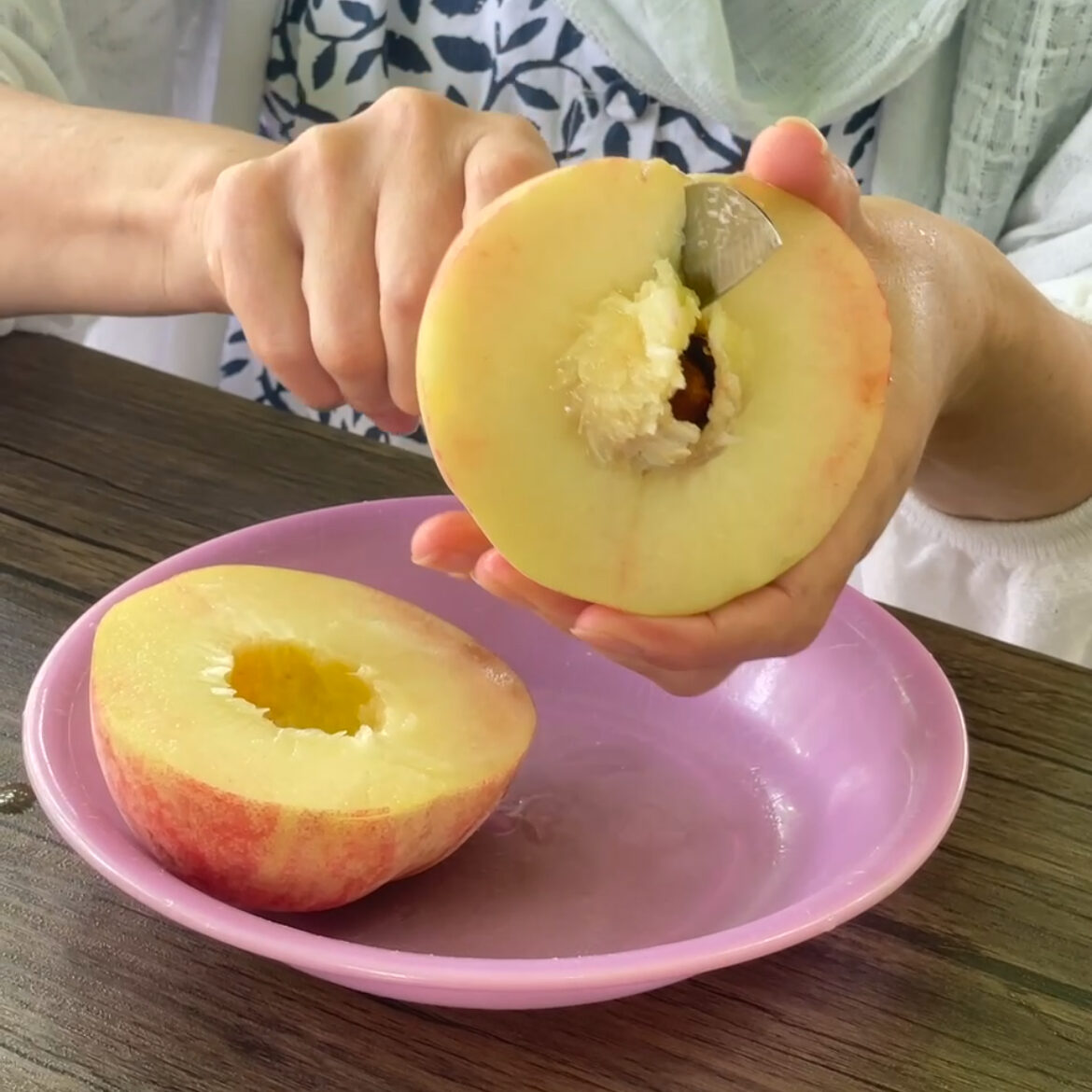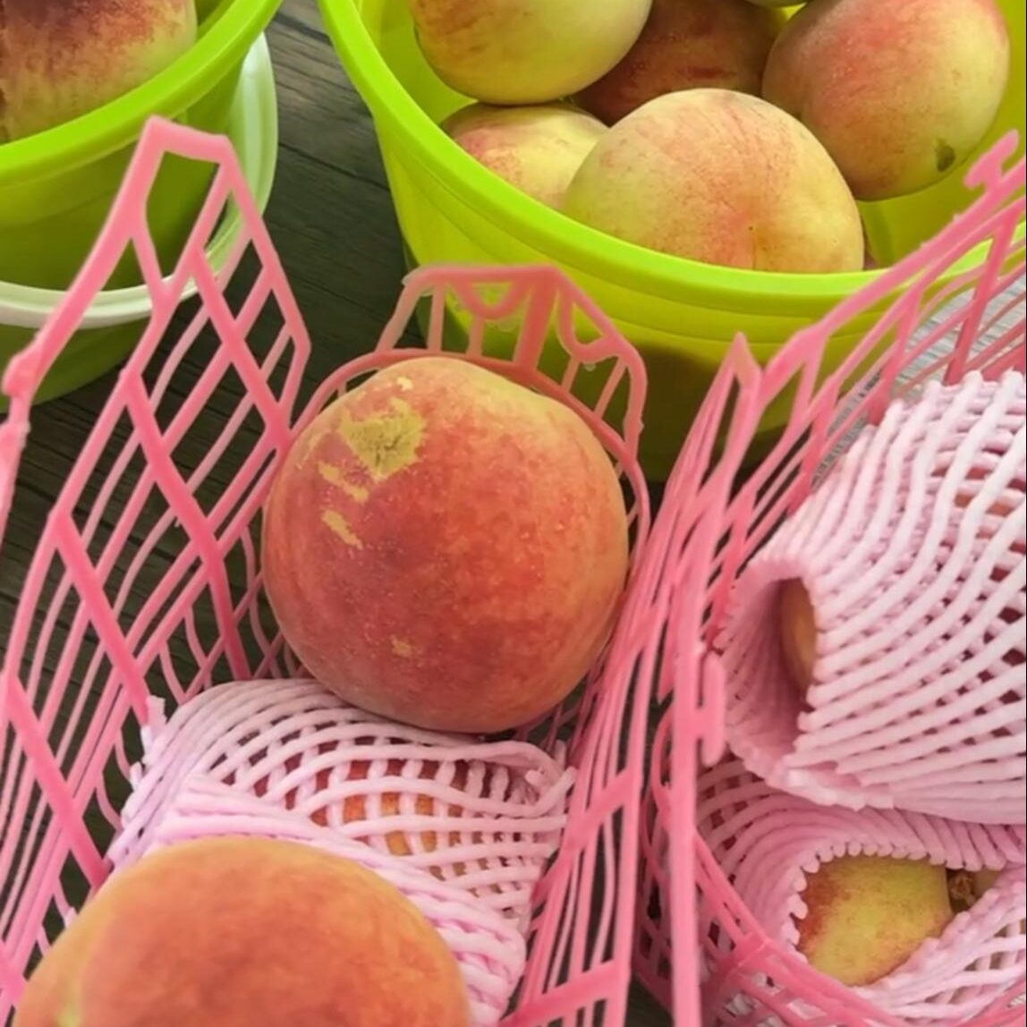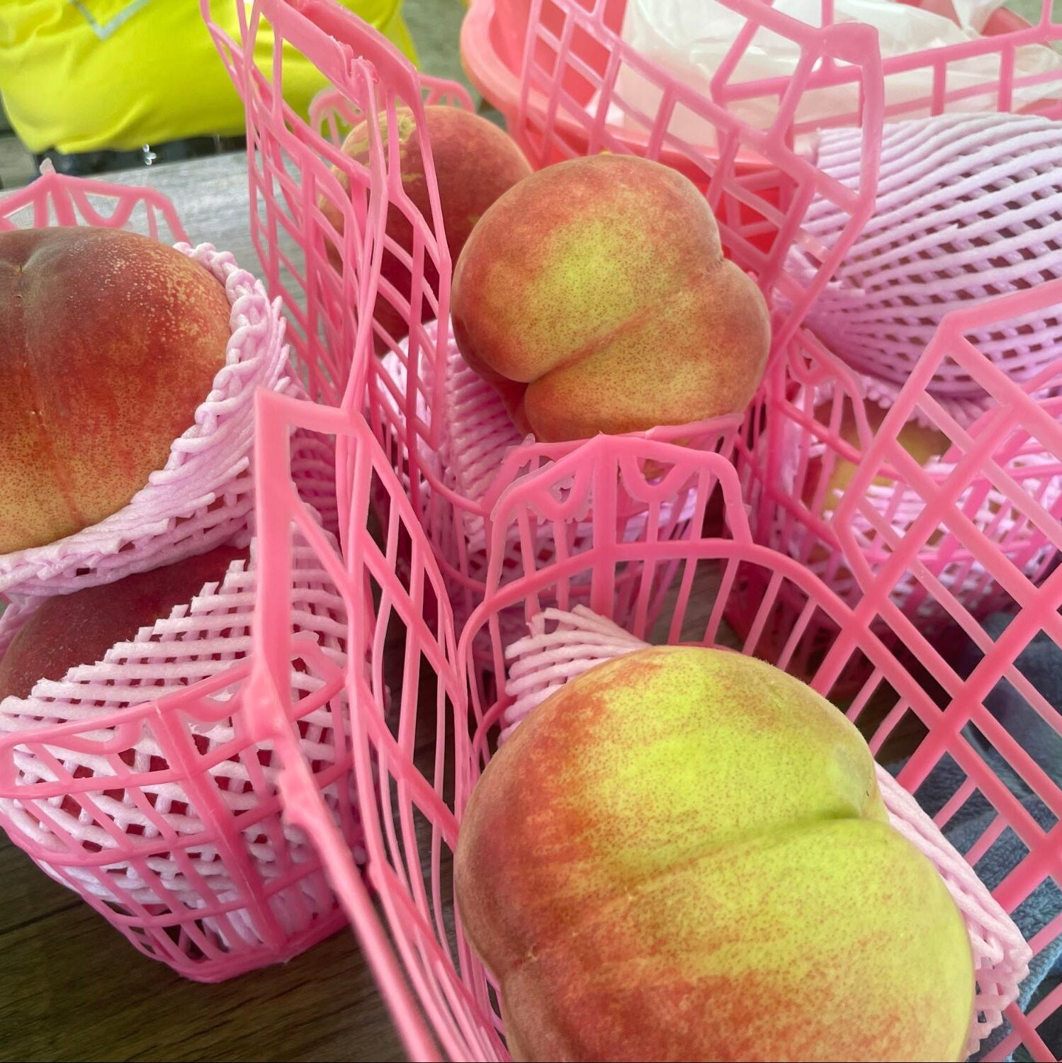 木漏れ日の中で赤く熟した桃が美しく並んでいます。